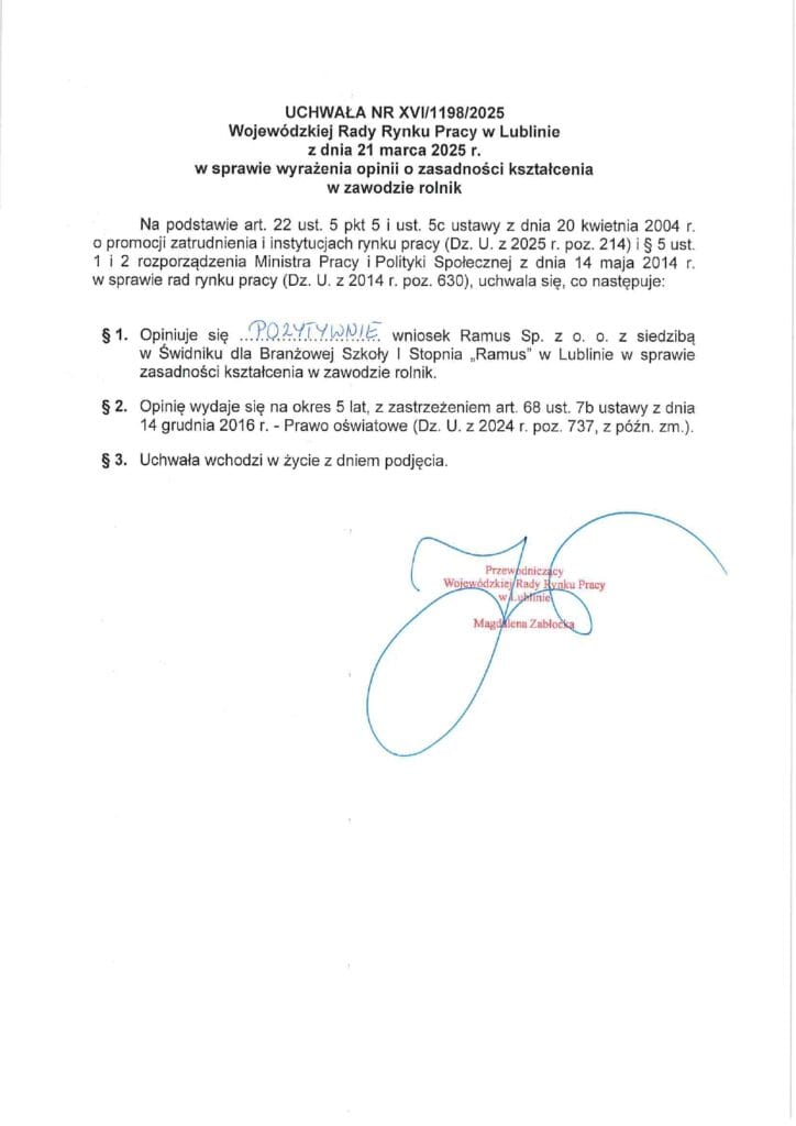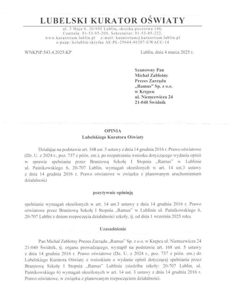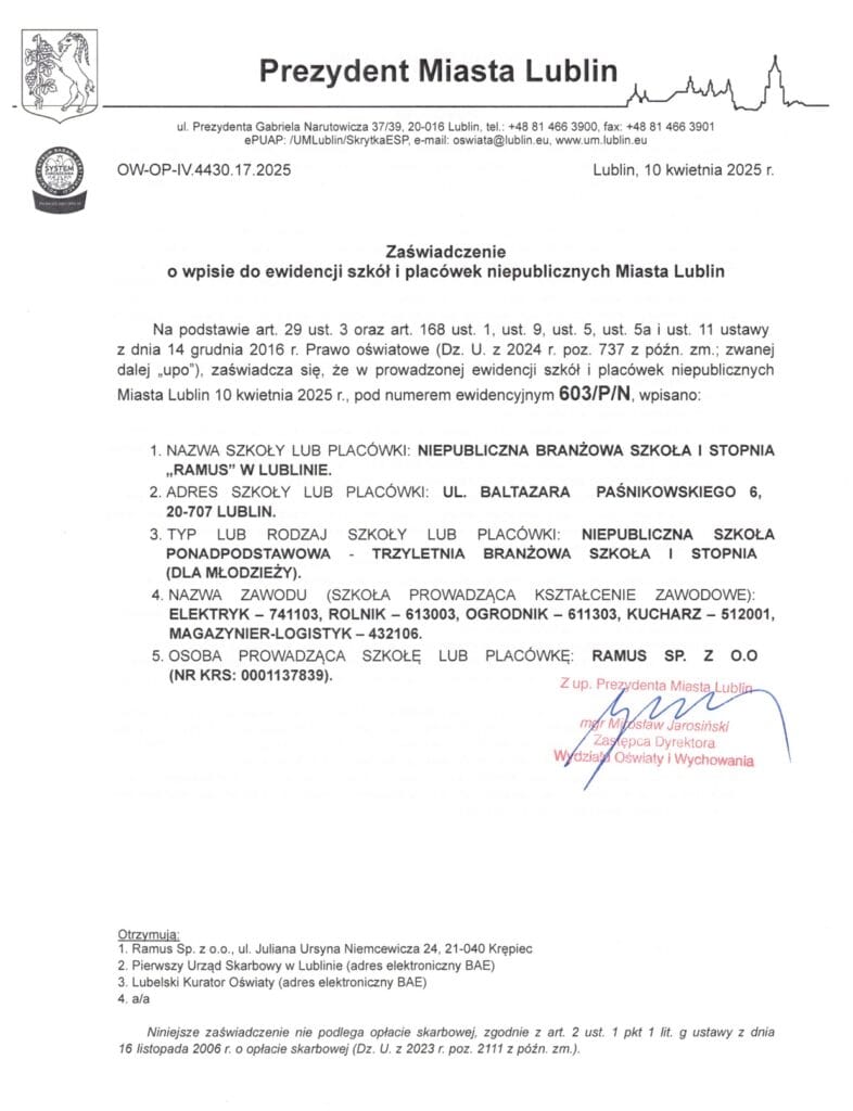 prowadzony jest przez Niepubliczną Szkołę Branżową I Stopnia "Ramus" w Lublinie